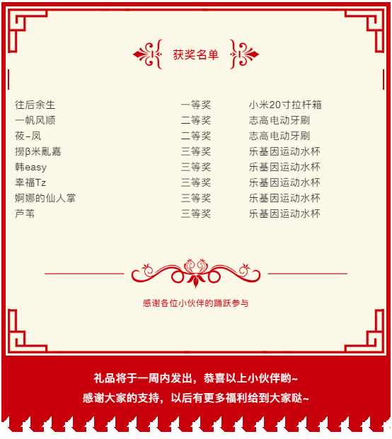 當當當,2019國慶活動(dòng)的獲獎名單新鮮出爐啦!快來(lái)看看有沒(méi)有你或者你朋友哦!